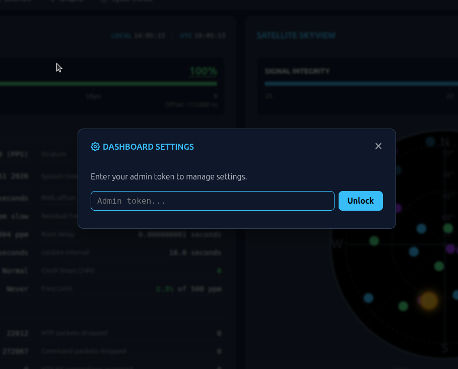 - Mission Control Layout: Live telemetry for Chrony sources, system tracking, and GPS satellite status. Interactive satellite skyview with instant CSS-driven popups. Precision diagnostics including TDOP, 3D Fix status, leap second status, and hardware serial paths.