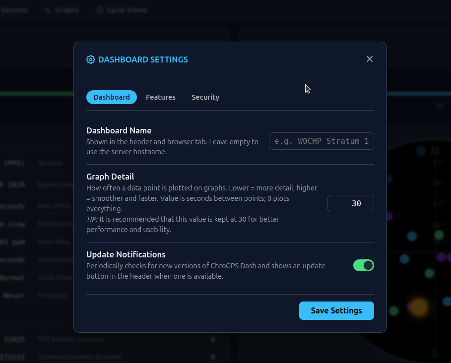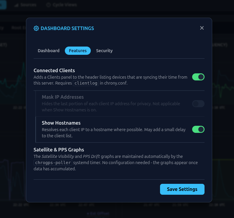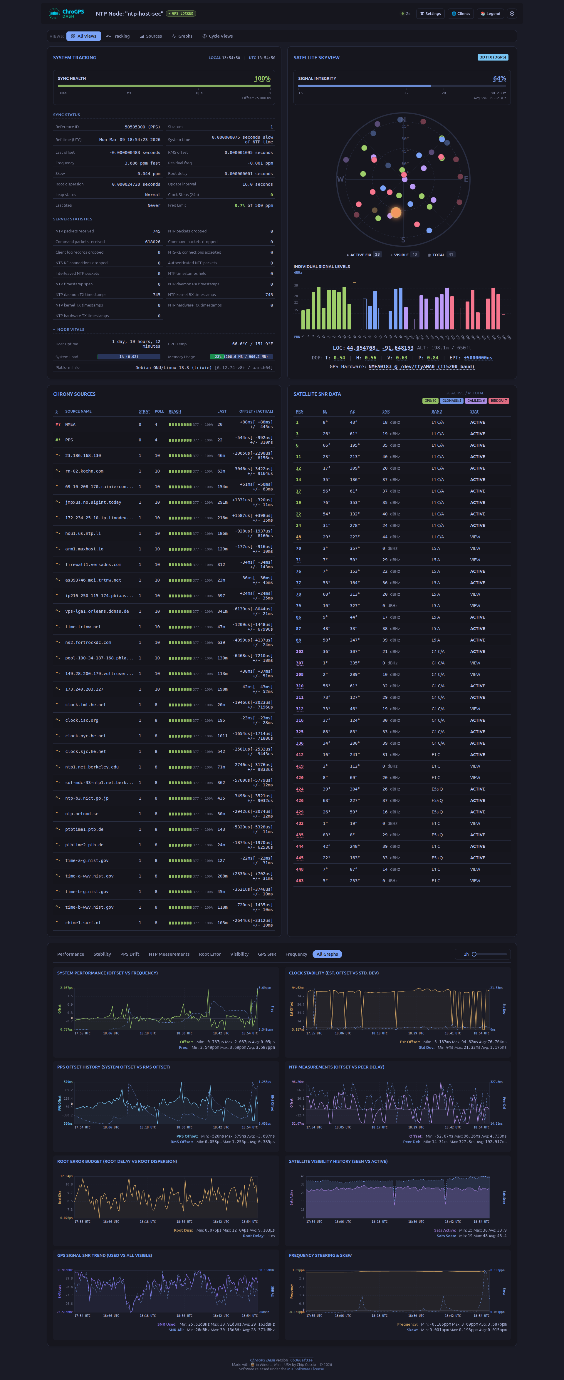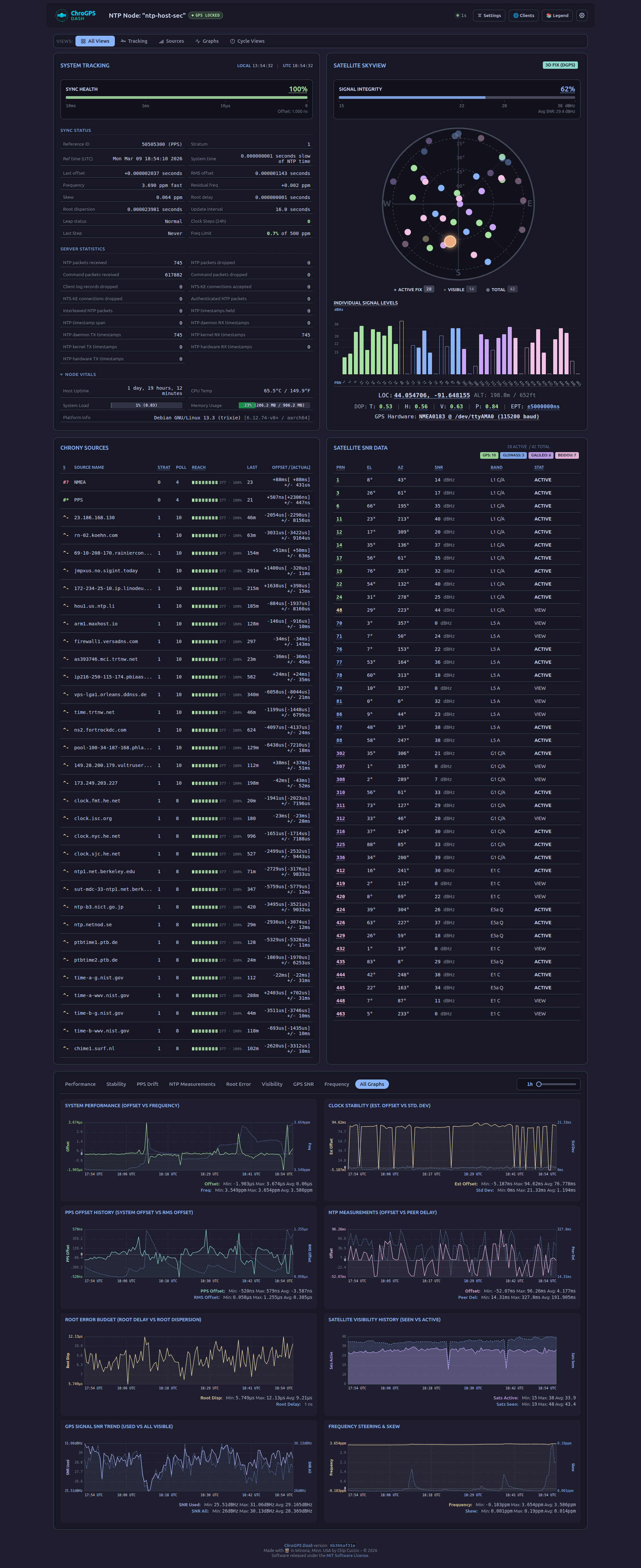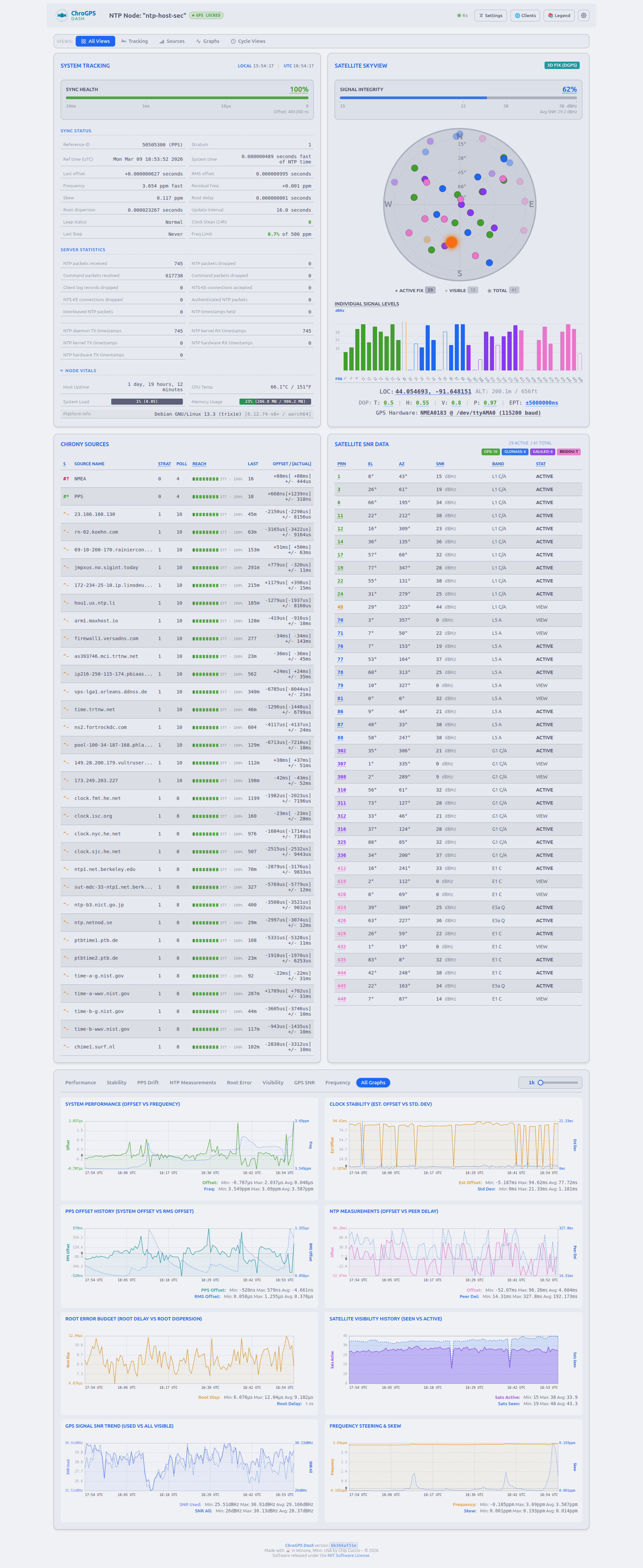 ChroGPS Dash is a lightweight, high-performance, and mobile-friendly web dashboard for monitoring GPS-disciplined Stratum 1 NTP servers on Debian 12/13 (and equivalent) which run Chrony and GPSd. It provides real-time diagnostics It provides real-time diagnostics & metrics for Chrony and GPSd, featuring a live satellite skyview, SNR telemetry, precision timing metrics, and more.