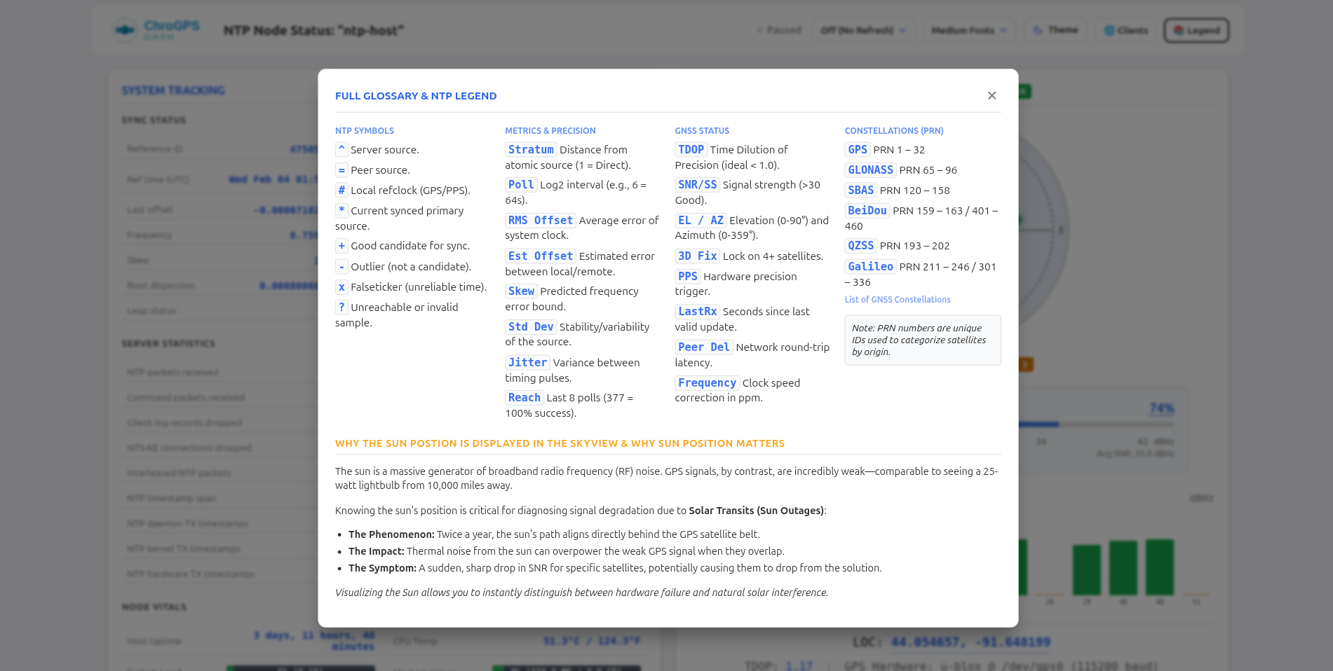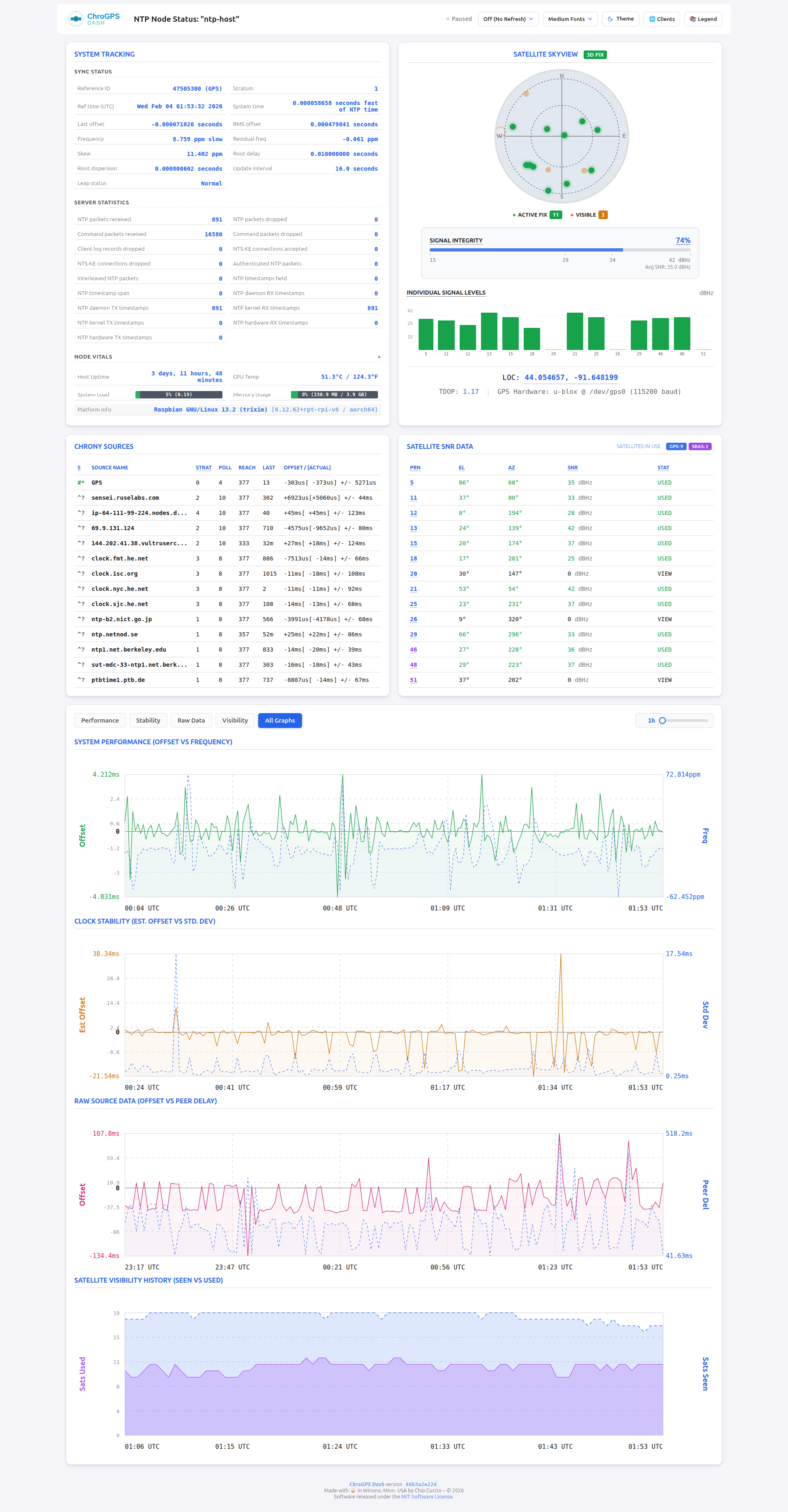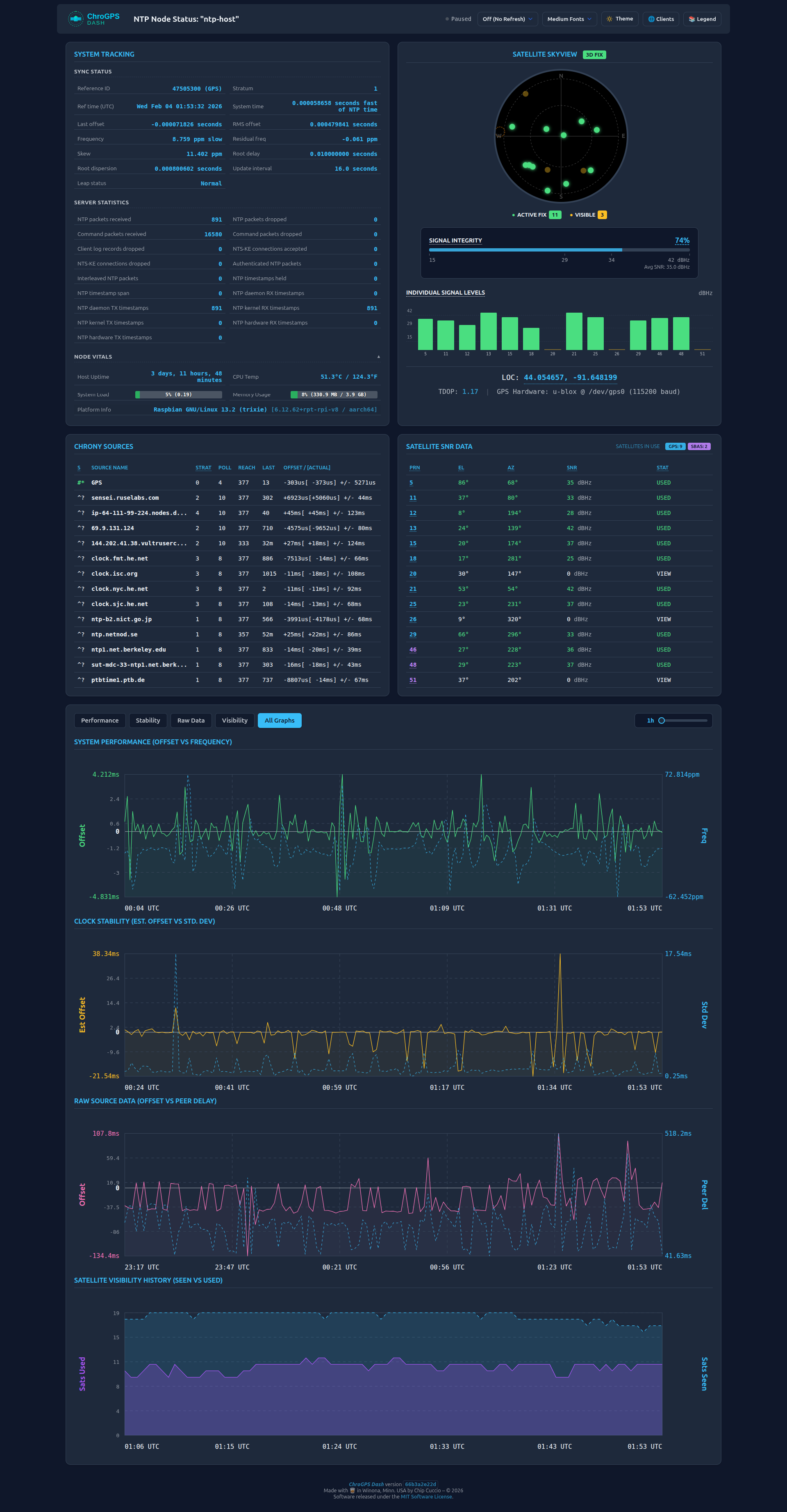- Real-Time Telemetry: Live updates for Chrony sources, system tracking, and GPS satellite status.