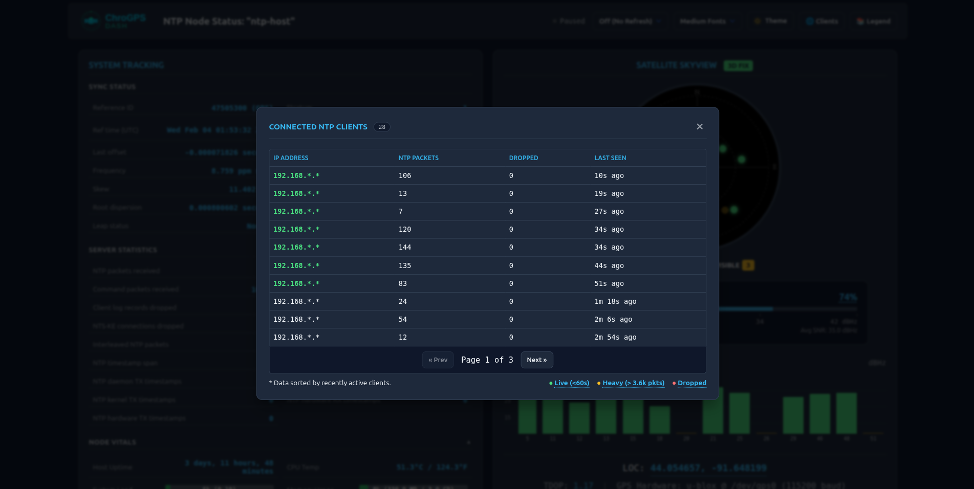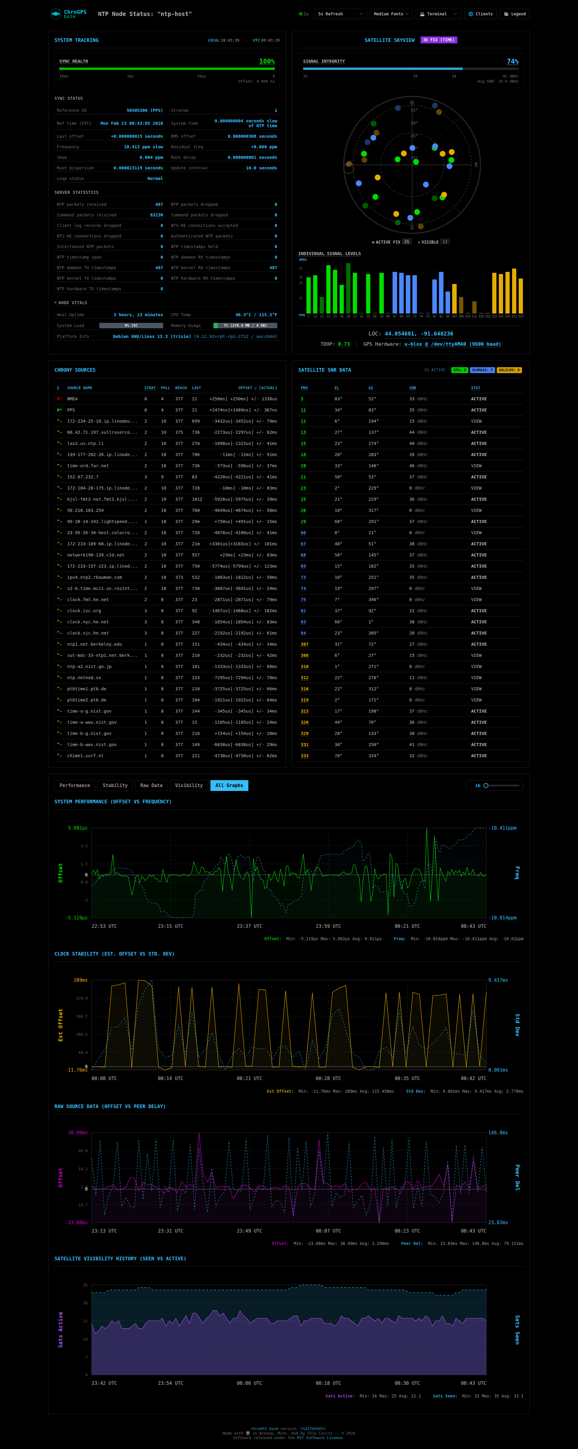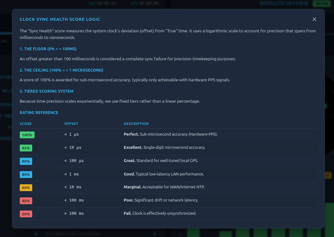- Real-Time Telemetry: Live updates for Chrony sources, system tracking, and GPS satellite status.