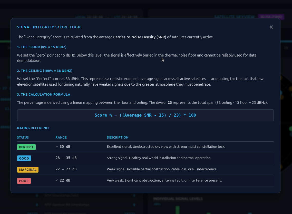 - Clock Sync Health Monitor: A logarithmic precision score that answers “The signal is good, but is the server keeping time?” Covers the full range from sub-microsecond PPS precision to millisecond-level WAN sync.